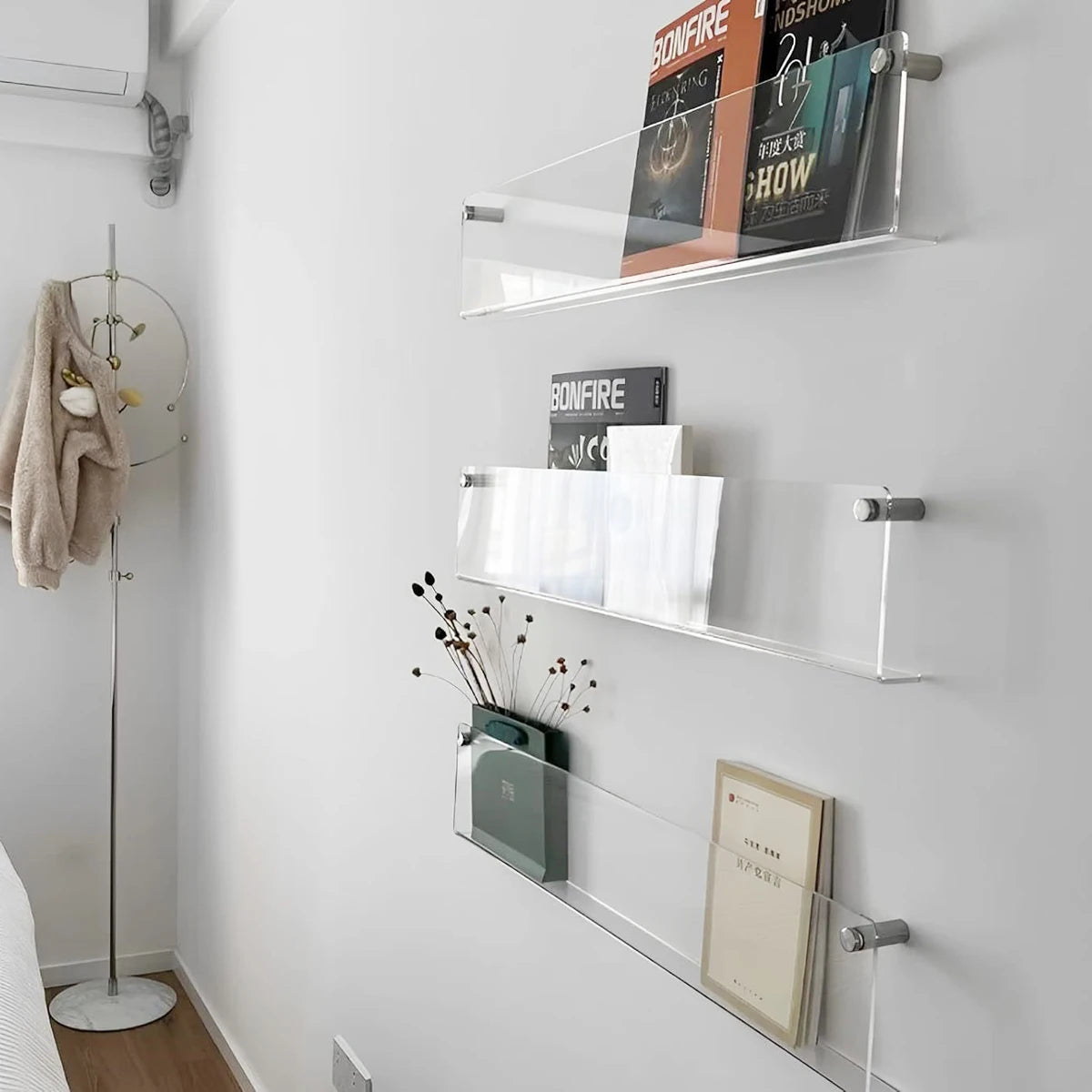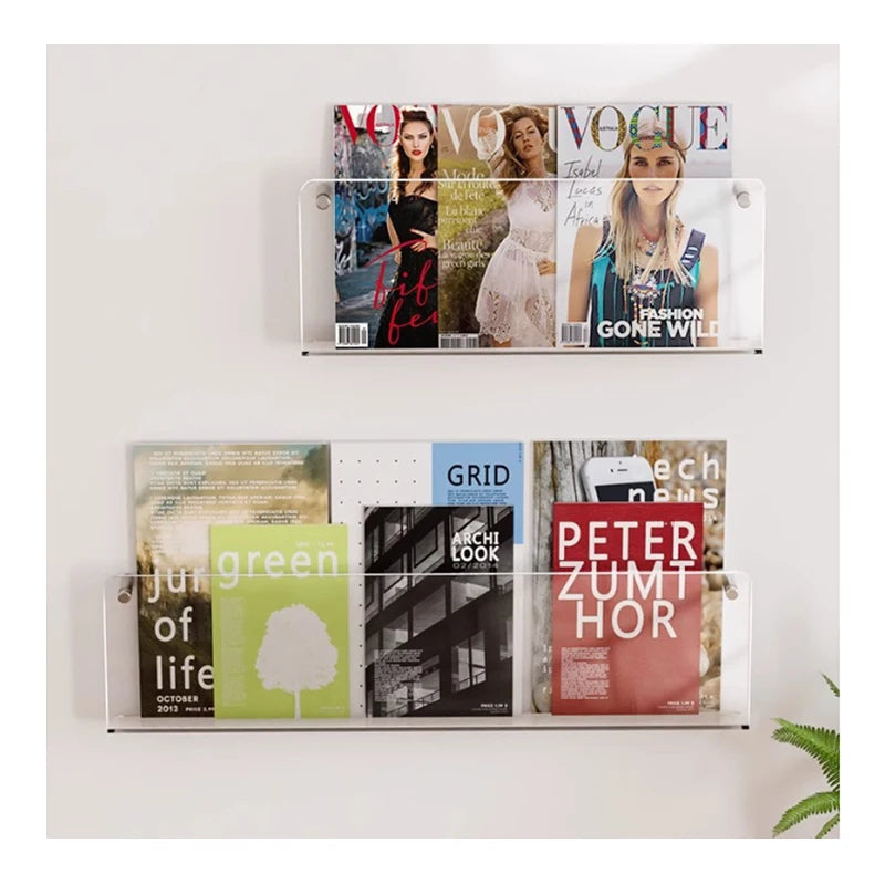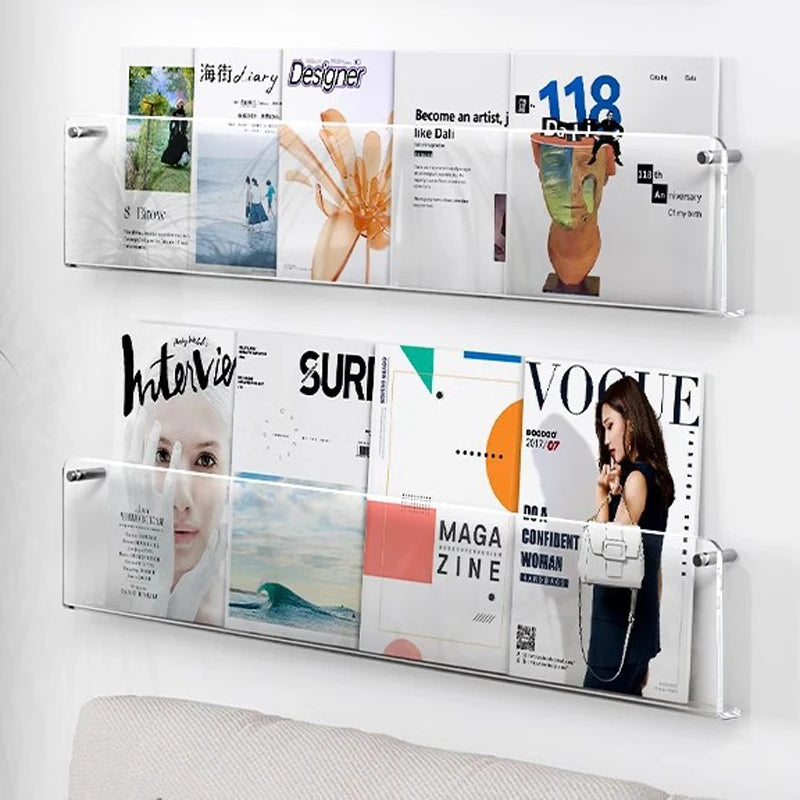 La struttura trasparente crea un effetto sospeso e ordinato, trasformando riviste e libri in una composizione grafica pulita. Ideale per ambienti contemporanei dove funzionalità ed estetica convivono senza eccessi.
