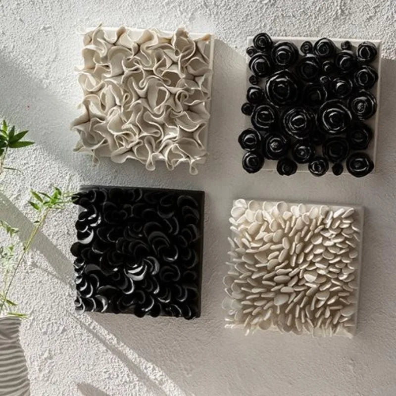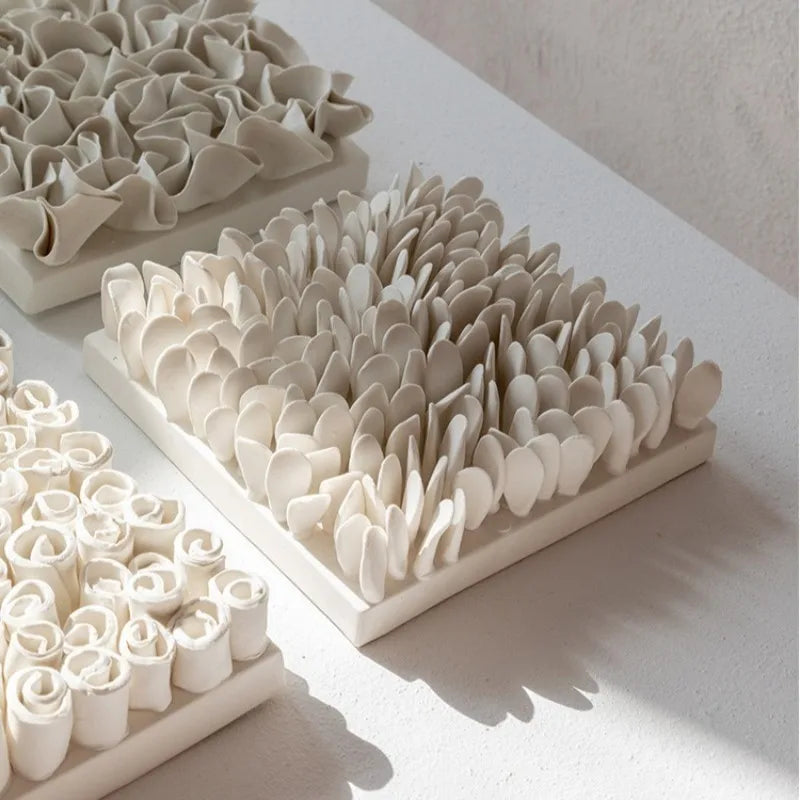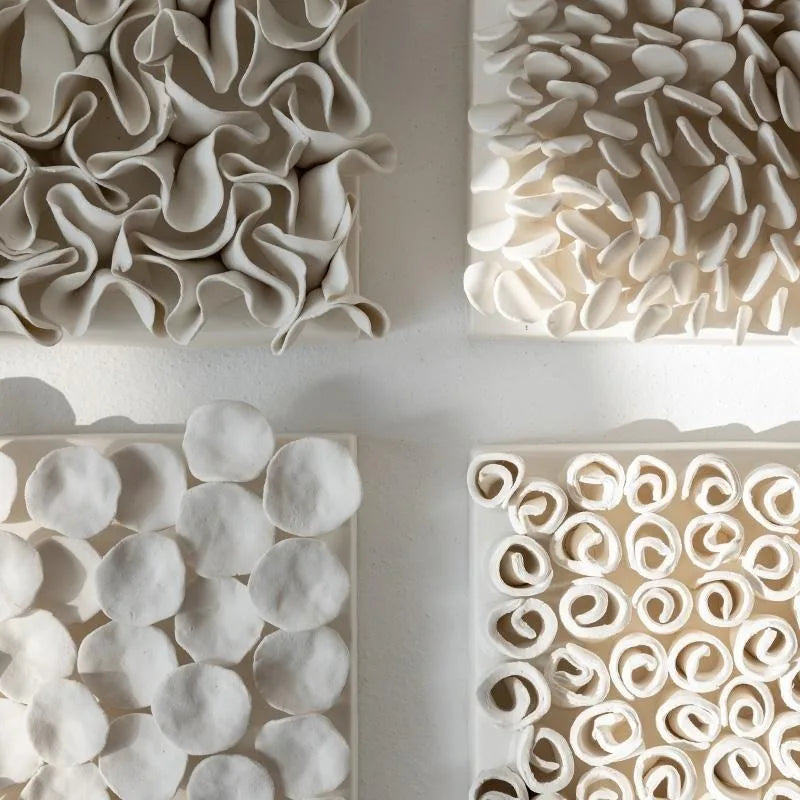 Pannello decorativo da parete in ceramica con lavorazione tridimensionale: un elemento scultoreo che trasforma la superficie murale in una composizione materica elegante e contemporanea.