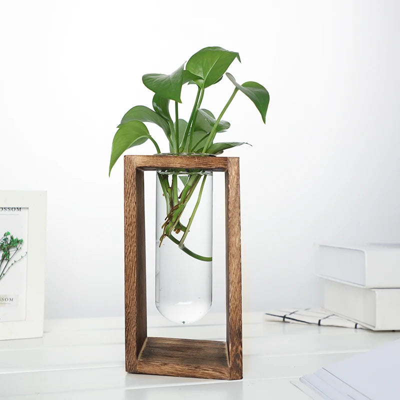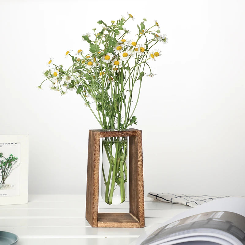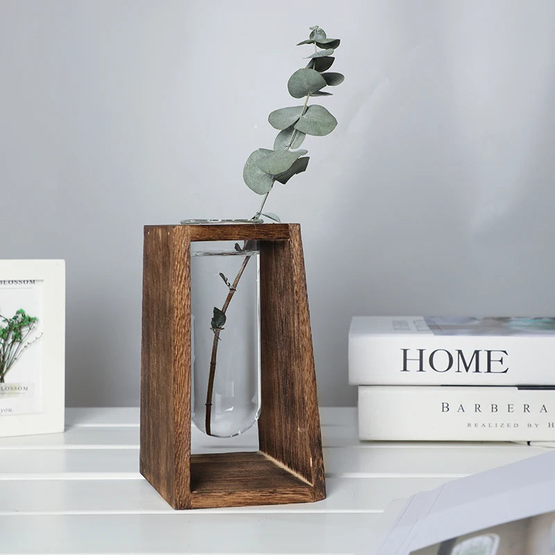 Un vaso decorativo in vetro sospeso all’interno di una cornice in legno naturale:
