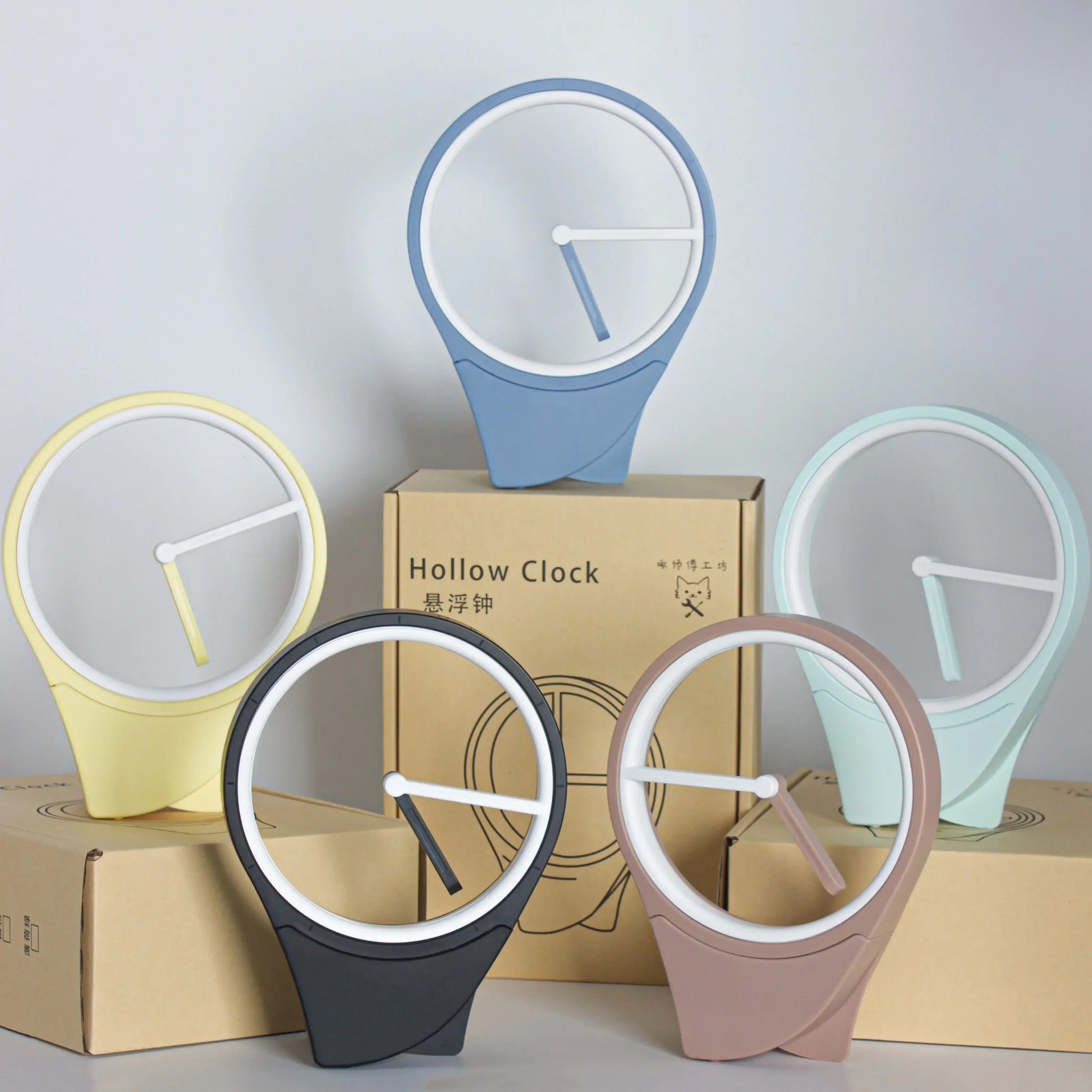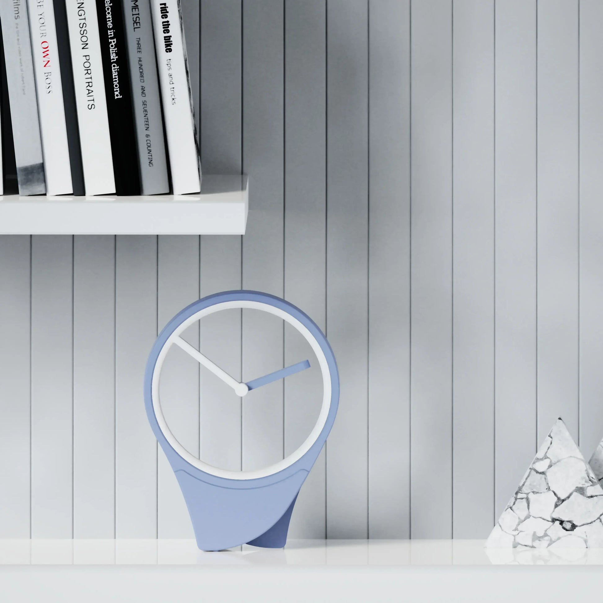 Un orologio da appoggio dal design circolare “floating”, senza quadrante tradizionale: un oggetto grafico e leggero che interpreta il tempo come gesto visivo, essenziale e contemporaneo.