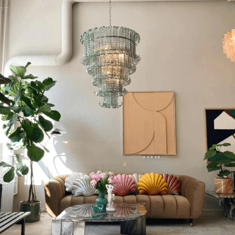 Un chandelier monumentale in vetro stratificato che richiama l’eleganza del design mid-century reinterpretato in chiave contemporanea. Una presenza scenica forte, pensata per dominare lo spazio con luce e materia.