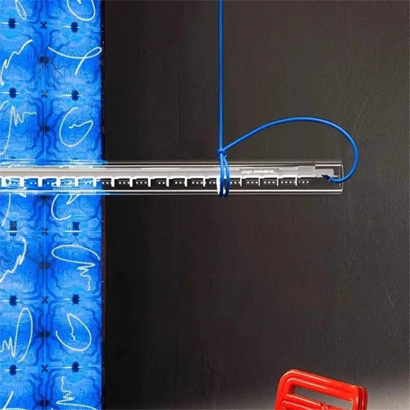 Una lampada a sospensione lineare dal carattere grafico e contemporaneo. Il tubo luminoso sospeso crea una linea netta nello spazio, ideale per ambienti moderni dove la luce diventa elemento architettonico.