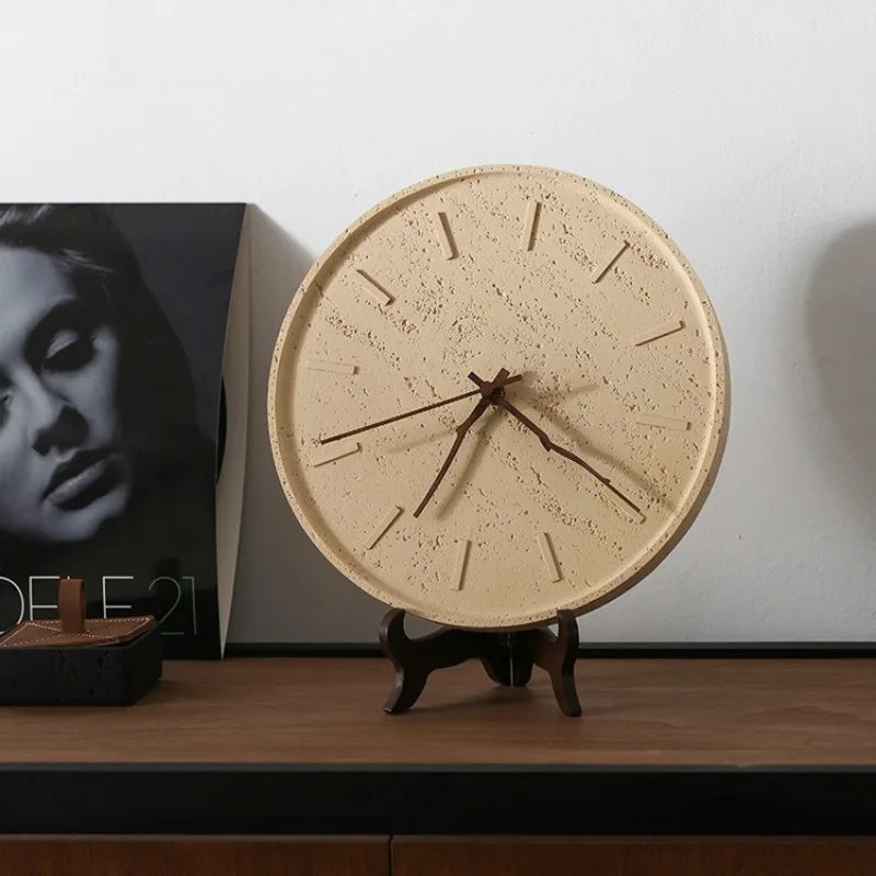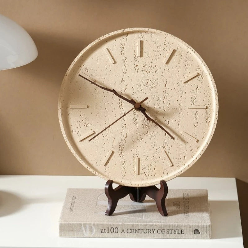 Un orologio da parete (o da appoggio) dal gusto nordico e materico: quadrante effetto pietra e indici in rilievo, per un segno essenziale che scalda lo spazio con una presenza discreta.