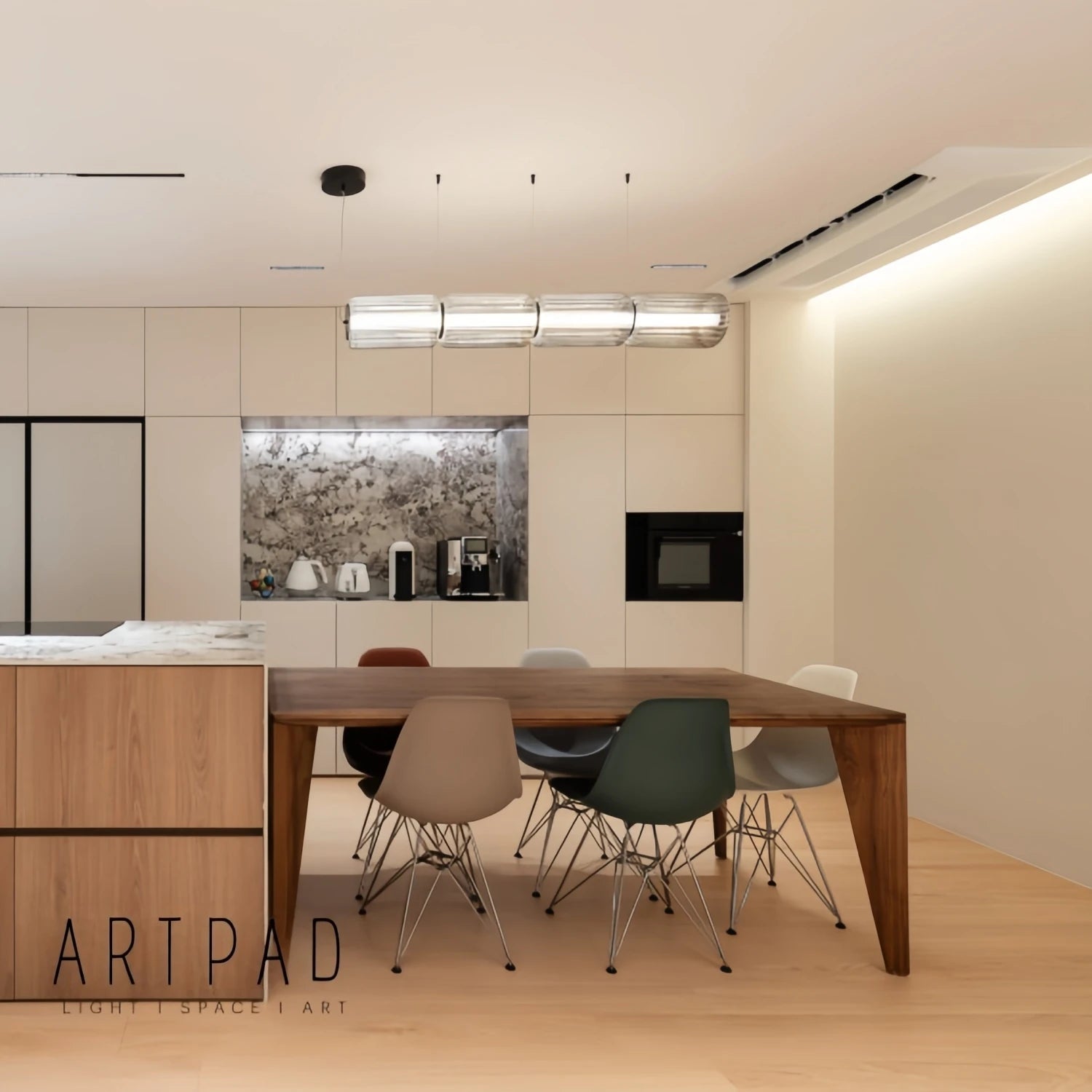 Una forma cilindrica continua che diffonde una luce calda e uniforme. Il corpo sospeso crea un effetto architettonico elegante, ideale sopra tavoli, isole cucina o zone dining.